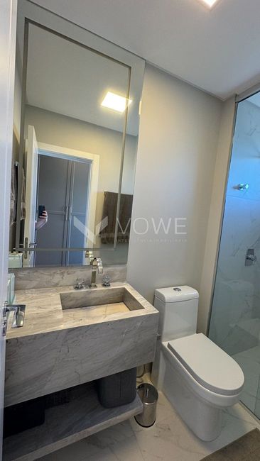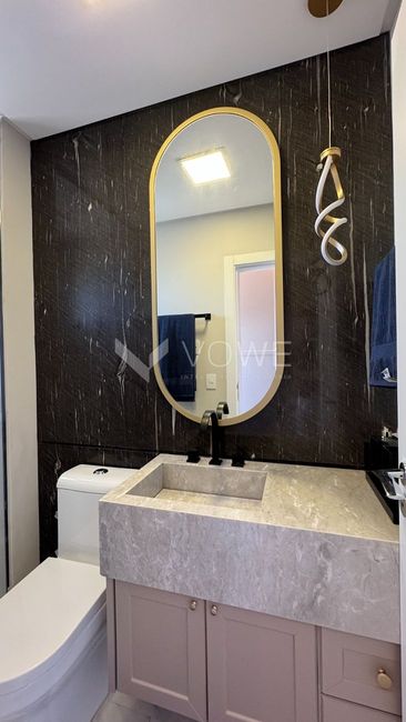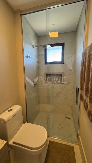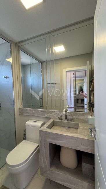 Piso em porcelanato no living, sacada, cozinha, área de serviço, banheiros e lavabo;